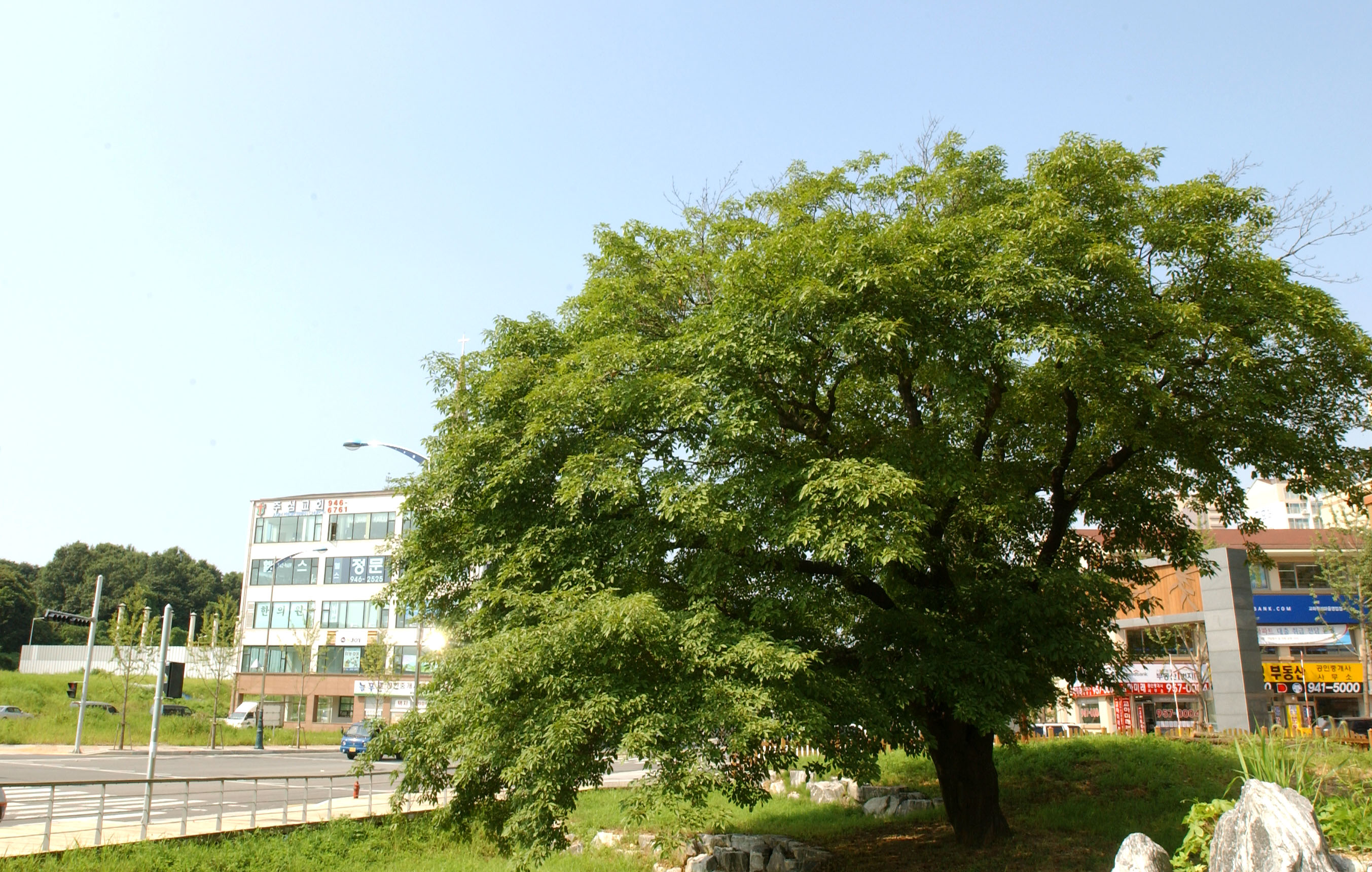줄기는 특이하게도 지상 약 1m 높이에서 북북동 방향으로 크게 돌출 생장부가 생겨있다. 이것이 지상 약 2m 높이에서 가지로 이어져 있기 때문에 줄기의 둘레는 위쪽이 아래쪽보다 더 굵어진 상태이다.