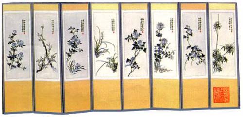 매난국죽의 순으로 수를 놓은 병풍이다. 아주 은은하면서 고풍스러운 분위기를 찾을 수 있는 우리 고유 정서에 맞는 병풍이다.