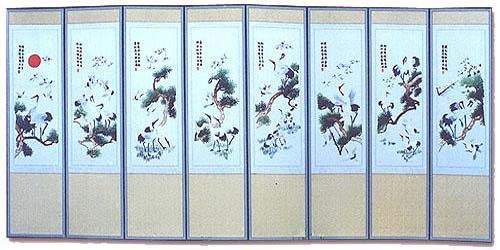 좌식생활을 한 우리의 생활 공간에는 병풍이 있어야만 제 멋이 났습니다. 병풍은 첩과 첩을 접합시켜 접었다 폈다 하기에 편리하도록 만들었습니다. 첩은 두 첩에서 열 두 첩까지 짝수로 구성되어 있으나 팔 첩 이상이 많이 이용되고 있습니다.
